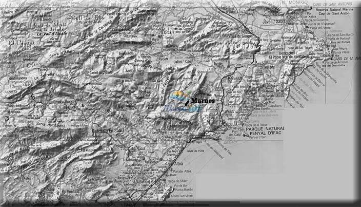 Marnes se encuentra enclavada en la ladera de una colina a 500 metros sobre el nivel del mar y está situada a 6 kilómetros del pueblo de Lliber. Actualmente consta de unas 30 casas aisladas y cultivos de secano, dominados principalmente por almendros que florecen a principios de febrero y que son una delicia para la vista, repartidos a lo largo de las clásicas terrazas con muros de piedra seca, tan típicas de esta región de España.